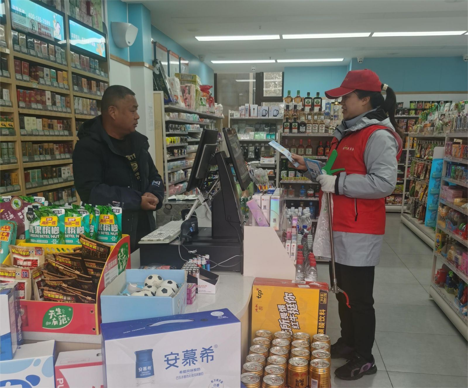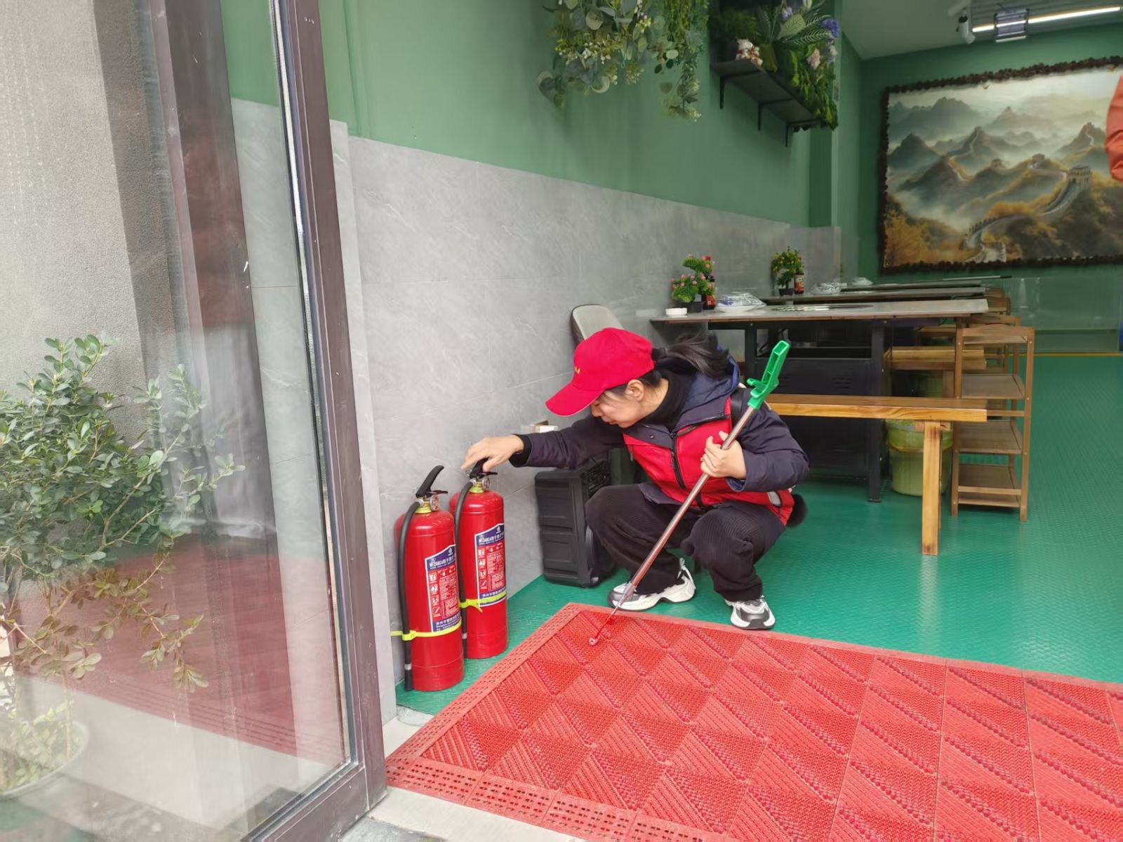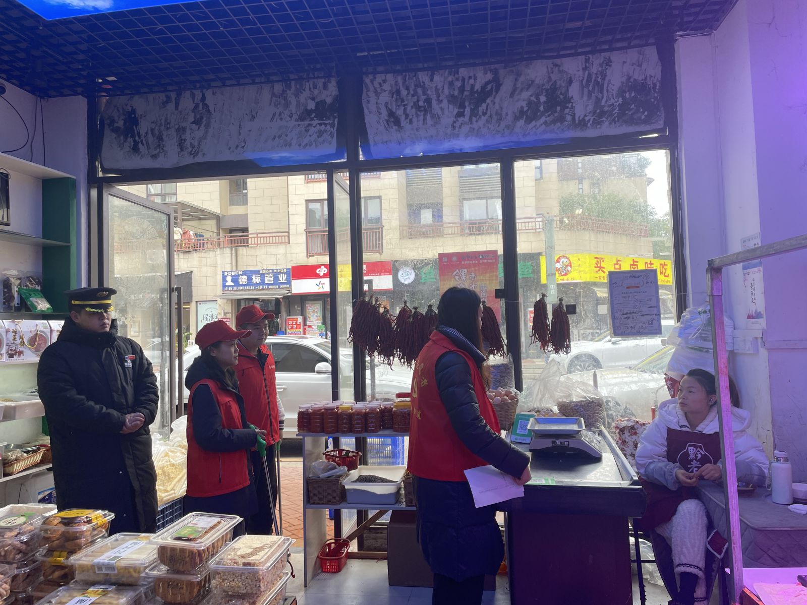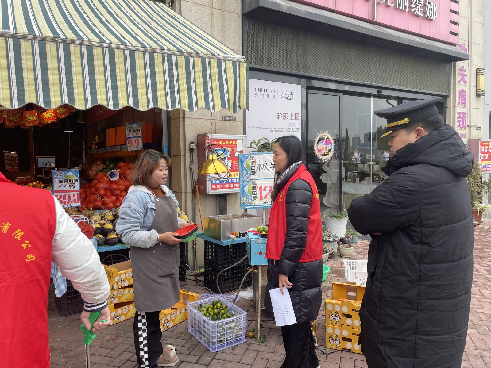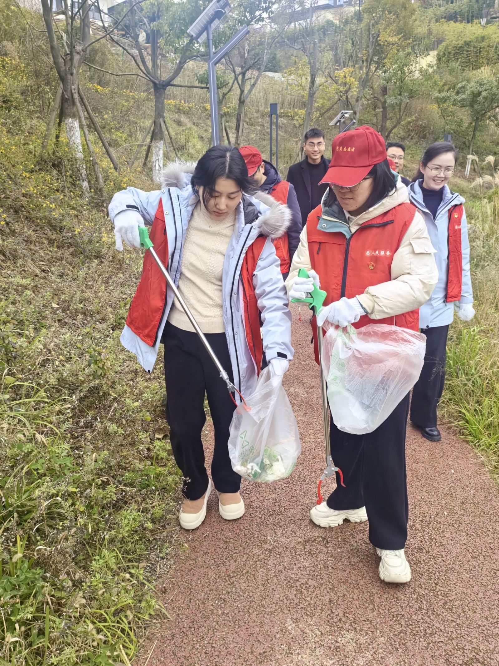 活动当天,大家精神饱满、兴致勃勃,围绕“湖边安全巡逻、卫生清理、街道经营秩序维护、商铺安全检查”等组成4个小组分头开展行动。在公园内,大家仔细查看园内道路及相关设施的安全情况,对路边的塑料垃圾进行捡拾清理,党员志愿者们鲜红的马甲在绿水青山的映衬下显得格外醒目。在街道上,大家挨家走访街道各商户,细心查看灭火设施维护情况、安全用火用电等情况,规范商户摊位摆放,开展垃圾分类宣传,引导商户爱护环境卫生、做到合规经营。