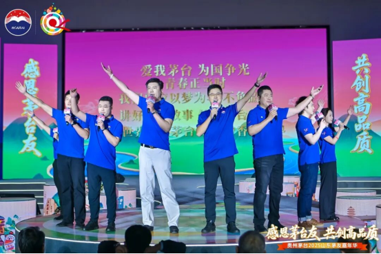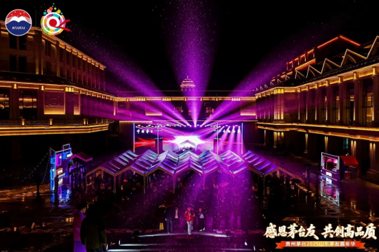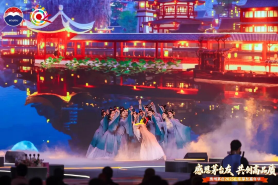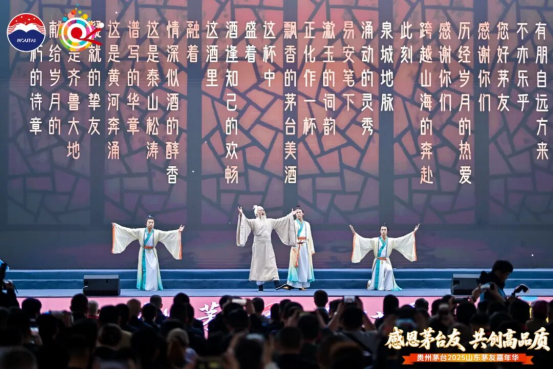 夜幕轻垂,茅友之夜如约启幕。“茅友家宴”与“微醺之夜”两个篇章层层递进,让每一位茅友在举杯共敬间,真情交流,切实感受到这份相聚里的感恩暖意与未来期许。“茅友家宴”篇章,开场舞剧《清照词笺·永遇乐》深度结合明水古城清照文化,借虚实交织的舞台设计,再现宋代文人雅集赏灯的盛景和“染柳烟浓”的诗意;山东茅台传承人携手唱响AI定制歌曲《友朋自远方来》,欢快的旋律、热情的唱腔,既唱出茅台的酒韵芬芳,更寄托着“四海茅友是一家”的美好愿景;特色乐器演奏流淌心弦,一曲曲明月相伴的雅韵悠长,串联起知己相逢的暖意,映照着与茅台共度的岁月静好。“微醺之夜”篇章,经典歌曲唱响岁月情怀、摇滚派对点燃热烈氛围、微醺民谣传递温柔情愫……茅友们在愉悦的视听享受中品鉴茅台之美,感受身心放松的惬意。当旋律渐入尾声,大家纷纷举起荧光棒,在璀璨光影与欢乐氛围中,为这场相聚暂画上圆满句点。