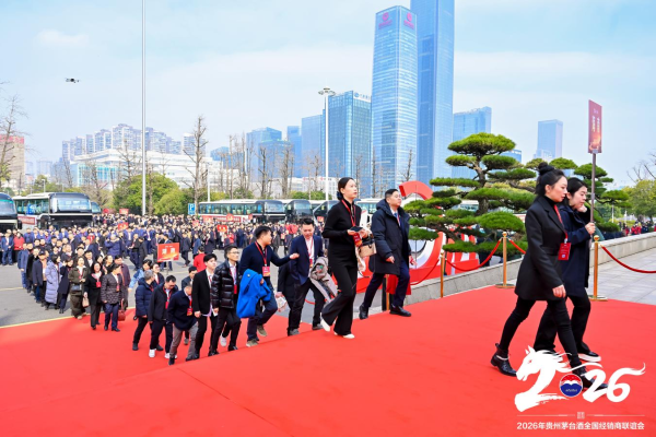 此次召开的2026年贵州茅台酒全国经销商联谊会,不仅是一年一度复盘全年市场工作的收官总结会,也是贵州茅台酒全国经销商联谊会自1999年启动召开以来,首次邀请渠道商全员出席,共话友谊、谋改革、求突破、促发展的一次“团圆”盛会。冬日暖阳融融,14时许,茅台集团及茅台酒股份公司领导整齐列队,满怀热忱迎接来自全国各地的1500余名经销商家人们,向大家亲切挥手、微笑致意,对大家一路以来的信任与支持致以诚挚感谢。