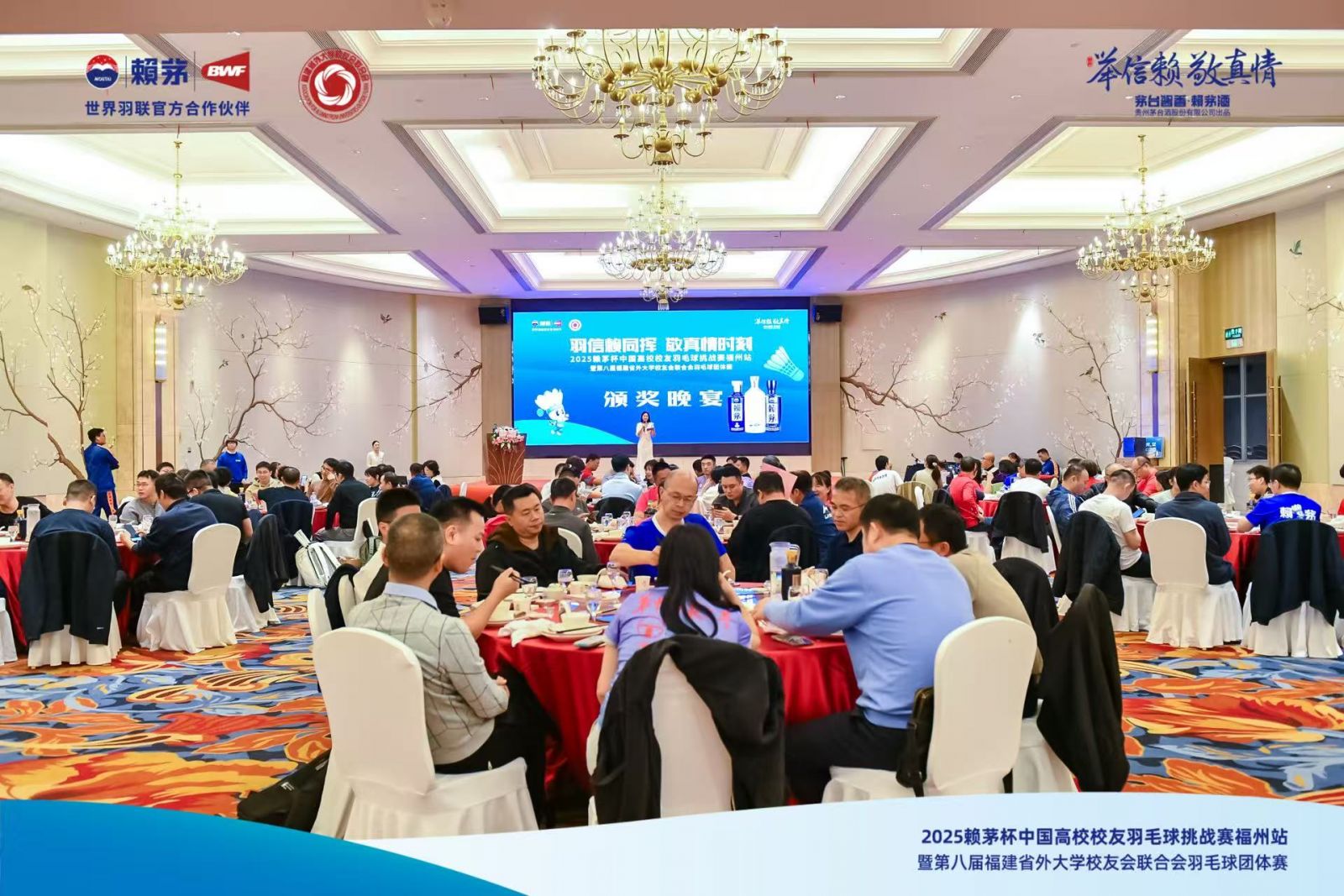 23日晚,梅园大酒店三楼灯火璀璨,2025赖茅杯中国高校校友羽毛球挑战赛福州站颁奖晚宴温情开场。这是最纯粹的校友相聚时刻——没有竞技的紧张,只有重逢的欢畅。